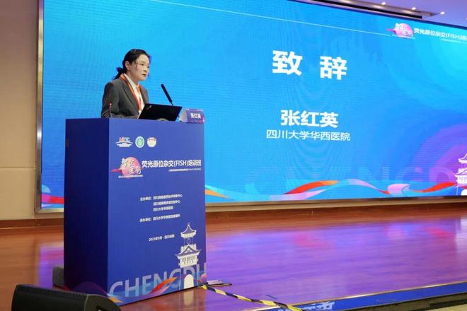 会议伊始,由四川大学华西医院病理科主任张红英教授致辞,她首先对远道而来的各位病理领域专家、同仁表示热烈欢迎,随后明确本次培训班的核心宗旨:一是强化FISH技术全流程质量控制能力,推动各级医院逐步精通FISH技术的操作规范、阅片逻辑与诊断标准;二是搭建跨单位、跨区域的专业交流桥梁,促进临床实践工作者分享经验、破解难题,为分子病理诊断水平整体提升奠定基础。