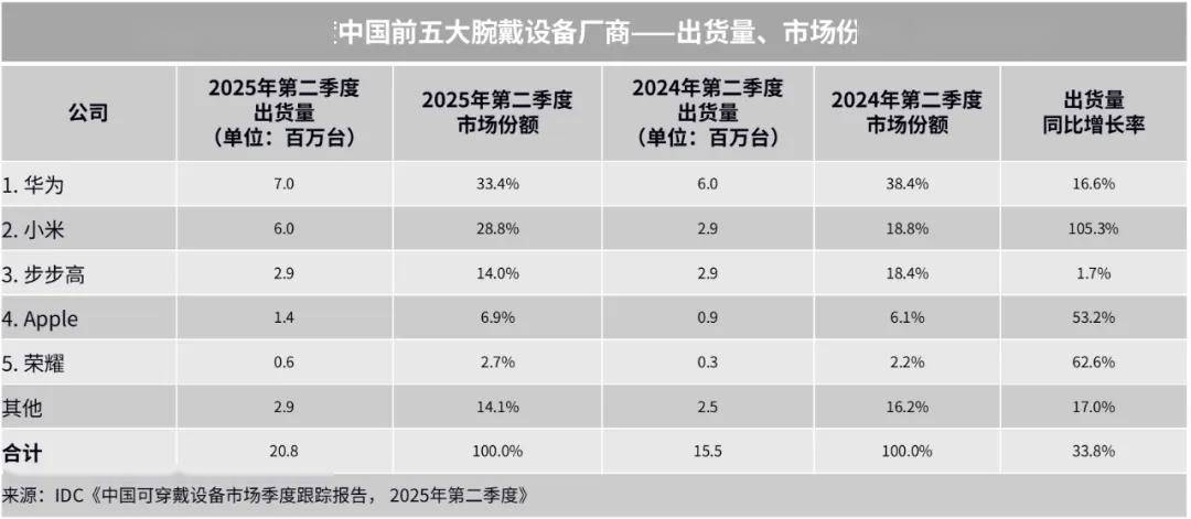根据国际数据公司(IDC)发布的《全球可穿戴设备市场季度跟踪报告》显示,2025 年第二季度,华为在全球腕戴设备市场与中国腕戴设备市场中均位列第一,斩获“双料冠军”。华为穿戴全球市场份额达 20.2%,每五台智能手表中就有一台是华为。