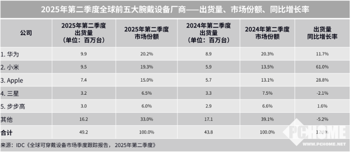 目前全球智能穿戴设备市场竞争激烈,但华为一直都是行业领头羊。IDC发布的数据显示,2025年二季度全球腕戴设备市场出货4922万台,而华为腕戴设备出货量逼近千万台大关,达到 990 万台,以 20.2% 的市场份额再度蝉联全球腕戴设备厂商榜首,这意味着每五台智能手表中就有一台是华为。无论是在中国市场还是全球市场,都位居第一。此外,华为在中国腕戴市场已经连续6年出货量第一,市场份额持续扩大。