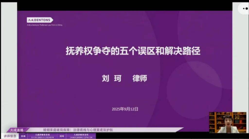 大成广州分所合伙人(待备案)、大成金融专业委员会婚姻继承与金融创新法律研究中心副秘书长刘珂律师分享的主题是《抚养权争夺的五个误区和解决路径》。刘珂律师从父母的经济优越性、子女两岁的年龄节点、抚养费与探视的关系、双胞胎子女抚养以及抢夺隐匿子女五个方面指出当事人在争夺抚养权方面的错误认知,并强调错误的认知会导致错误的行为,错误的行为会带来错误的结果。刘珂律师通过对抚养权的错误认知进行拆解,针对争取抚养权提出切实可行的具体建议:1. 保证稳定收入;2. 保持与孩子共同生活;3. 投入更多的时间和精力;4. 己方父母协助抚养;5. 保障对方的探视;6. 权利让渡,满足对方的其他诉求;7. 对方抢夺藏匿子女,要及时主张权利。