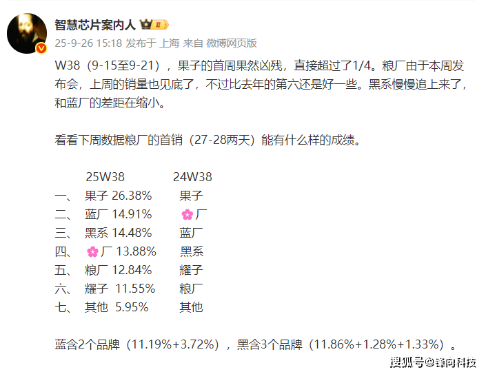 OPPO系三个品牌加在一起排名第三,市场份额为14.48%。华为以13.88%的份额排名第四,小米以12.84的份额排名第五,荣耀以11.55%的份额排名第六。大家要注意本周苹果的份额是小米的两倍还要多,也是荣耀的两倍还要多。有意思的是同比去年同一时间除了苹果还是第一之外,其它位置的排名全都发生了变化。在给出数据的同时行业人士也表示苹果首周果然凶残,直接超过了四分之一。小米由于小米17系列在本周发布,W38周的销量见底了,不过比去年第六还是好一些,OPPO系列的销量慢慢追上来了,与vivo之间的差距在缩小。